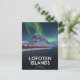 Witness the stunning Arctic beauty of the Lofoten Islands, Norway, with this dramatic vintage-style postcard. The design features a row of iconic red fisherman's cabins (rorbuer) nestled beneath a snow-capped mountain, all illuminated by the spectacular Northern Lights (Aurora Borealis) across a dark, starry sky. This travel poster is perfect for lovers of Scandinavian travel, winter scenes, and celestial phenomena. Ideal for sending greetings, keeping as a keepsake, or framing as sophisticated wall art.