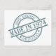 Caractérisé par un logo rond vert de style tampon en caoutchouc avec « Cent pour cent authentique » écrit en haut et « Original » en bas encadré par des étoiles de chaque côté, et « Fabriqué en 1974 » écrit sur le devant entre deux lignes en angle, c'est la carte de vœux parfaite à envoyer à quiconque est né en 1974.