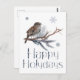 Charmante carte postale de vacances d'hiver avec l'image d'un oiseau mignon assis sur une branche de pin et chantant une chanson d'hiver. Texte décoratif Happy Holidays est situé sous l'image, et des flocons de neige de couleur argent volent autour de l'image. Envoyez vos voeux les plus sincères et les plus chaleureux à votre famille, à vos proches et à vos amis. Vous pouvez transférer cette conception à un certain nombre d'autres produits, y compris les magnets, les cartes, les affiches, les puzzles. Ce design est personnalisable. Vous pouvez modifier l'image. Si vous souhaitez modifier la taille de l'image ou la recomposer sur un produit choisi, n'hésitez pas à utiliser le bouton "Edit Design" ou "Personnaliser" (selon le coque) de la couleur bleue. Vous serez transféré à l'outil de conception où vous pouvez modifier la taille, déplacer des images sur le panneau de menu de droite, et vous pouvez ajouter du texte sur le panneau de menu de gauche. Soyez créatif, customisez et achetez-en un, et soyez heureux !