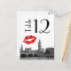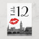 London England Skyline #1 BW Black White, Red Lipstick Kiss - Table Number Card Personnalisable Invitations et accessoires avec une vue iconique de l'horizon de Londres avec une photo en noir et blanc gravé de Big Ben et un baiser rouge à lèvres. Ce produit fait partie d'une suite de conceptions de jumelage et de coordination qui sont facilement personnalisables pour de nombreuses occasions et événements. Si vous avez besoin de cartes RSVP assorties, notes de remerciements, timbres, magnets ou autres accessoires, veuillez consulter nos autres annonces. Si vous ne voyez pas un produit correspondant qui vous intéresse, ou si vous souhaitez voir ce design dans des couleurs différentes, avec des éléments d'autres designs, ou avec différentes photos NYCisMyMuse que vous voyez dans notre magasin, veuillez nous contacter et nous serons heureux de customiser un design pour vous! Veuillez noter qu'il s'agit d'une conception graphique et qu'elle ne contient aucun tissu, métal, gravure ou gaufrage. 2013 ©NYCisMyMuse Tous droits réservés