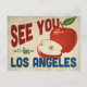 Une charmante carte postale de voyage de Los Angeles en Californie, avec une jolie pomme rouge, et un texte amusant de style rétro qui dit, "À Los Angeles, vous voyez"
