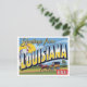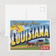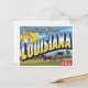 This charming, retro-style design captures the unique culture of the Pelican State. It features the classic "Greetings from LOUISIANA" typography set against a scene showcasing a horse-drawn carriage (suggesting New Orleans' French Quarter) and a large white bird, like the state's iconic pelican. This artwork perfectly blends the state's historical charm and coastal wildlife. Perfect for fans of vintage travel posters, retro artwork, Southern history, and the vibrant culture of New Orleans and the Bayou.