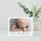 Un faire-part de naissance photo sucré et une carte de remerciement avec un type moderne simple et une photo unique sur le devant. Le dos est une carte postale avec un grand en-tête de nom complet et un message personnel de la famille. Cliquez sur le bouton Modifier pour customiser cette conception avec vos photos et détails.