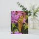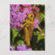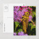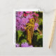 La sauterelle est un symbole de chance dans le monde entier. Cette carte postale de photographie d'art met en vedette une escalade de sauterelle jaune et marron, qui s'élève sur une fleur flossante rose, rouge et magenta ageratum. Il regarde par-dessus son épaule le photographe avec son énorme oeil d'or et de noir. Joli feuillage vert encadre la photo. Peut-être que cette carte postale aura un charme de chance !