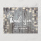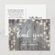 Lumières rustiques tombant sur du bois gris foncé avec le texte "merci" carte de mariage. Message peut être personnalisé ou supprimer le texte pour un message manuscrit.