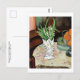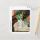 Une carte postale d'art avec le tableau, Bouquet de Lily de la Vallée dans un Vase (1931) de Suzanne Valadon (1865-1938), Une vie morte représentant un groupement de fleurs de lys dans un vase en céramique blanche à côté d'un bol de verre d'oranges.