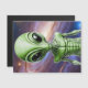 Carte postale magnétique représentant un alien en gros plan avec un arrière plan montrant des galaxies