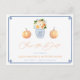 Conception de carte postale "Save The Date" intemporelle avec un vase en forme de jarre au gingembre bleu et blanc peint à la main rempli de fleurs aquarellées. De chaque côté, se trouve un classique citrouille orange. J'ai configuré le modèle pour un Save The Date de mariage, mais tous les champs de texte sont entièrement flexibles. À l'exception des fleurs et des feuilles, tous les éléments aquarellés ont été peints à la main par moi avant d'être numérisés et assemblés en un motif répétitif. Vous pouvez changer la couleur de la bordure à la grecque sur le devant en n'importe quelle couleur que vous aimez en changeant simplement la couleur de fond à l'intérieur de l'outil de conception (cliquez / appuyez sur "personnaliser davantage" pour accéder à l'outil de conception).