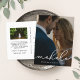 Une photo moderne et élégante carte postale de remerciement conçu pour accommoder votre photo mariage préférée verticale ou orientée portrait avec le Hawaiien merci de saluer "Mahalo" comme un script blanc superposition texte. s aligné côte à côte. Personnalisez avec vos noms et/ou la date mariage en dessous. Les cartes postales sont inversées pour montrer votre adresse de retour avec suffisamment d'espace pour l'adressage du destinataire, ainsi qu'un message pré-imprimé et une photo supplémentaire en option. Si vous préférez ajouter un message manuscrit, supprimez simplement l'exemple de texte affiché.