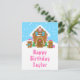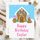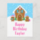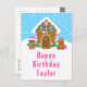 Cette carte d'anniversaire mignonne et festive peut être personnalisée avec un nom ou un titre tel que fille, petite-fille, nièce, amie, etc. Le design présente une maison en pain d'épice décorée de bonbons de Noël roses et verts. À côté se trouvent de mignons bonbons en pain d'épice avec des cadeaux, habillés de chapeaux et d'une écharpe de Père Noël. En arrière-plan, un ciel d'hiver d'un bleu vif avec des flocons de neige élégants qui tombent. Le texte est dans une police grasse et festive. C'est parfait pour Noël et les vacances d'hiver.