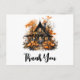 Carte de remerciement avec une illustration cool et effrayante d'une maison hantée en bois. Entourée de grosses citrouilles orange et d'arbres aux feuilles orange. Des fenêtres avec des lumières orange ajoutent une belle lueur. Création amusante pour Halloween.