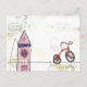 Carte postale des maisons cassées par l'artiste John Allen. la maison est colorée à l'extérieur mais en dessous se trouve un fil bardé avec une fleur de dos et tricycle vide.