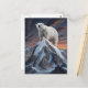 Un ours polaire majestueux trône fièrement au sommet d'une montagne imposante, sa fourrure scintillante au soleil sur fond de pics glacés et d'un ciel bleu clair.