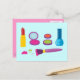 Cette illustration de maquillage brillante et colorée présente un assortiment de très beaux cosmétiques comme le rouge à lèvres, le vernis à ongles bleu, l'ombre verte orange et citron vert et le rougissement rose chaud et une jolie brosse violette! Ce maquillage de cosmétique est le cadeau idéal pour un cosmétologue, un maquilleur, un étudiant en école de beauté ou toute personne qui aime les couleurs néons brillantes et rétro des années 80 et l'art original amusant!