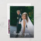 Un mariage moderne vous remercie carte postale avec votre photo superposée avec "merci" dans un script blanc avec des swashes et vos noms et date mariage dans une simple typographie blanche. Au contraire, ajoutez une photo supplémentaire, personnalisez un message de remerciement et ajoutez vos noms dans un script signature.