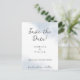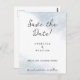 Cette simple carte postale minimaliste de plage Save the Date présente des polices de caractères classiques et modernes sur un arrière - plan abstrait bleu et blanc poussiéreux d'inspiration marine. Vous pouvez facilement personnaliser ce mariage océanique enregistrer l'invitation à jour avec vos propres détails en utilisant ce design sur le thème de l'océan et la palette de couleurs côtières. Il est polyvalent et peut être utilisé pour correspondre à toutes les idées et la décoration mariages sur le thème de la plage. Ces invitations minimes et élégants de mariage de plage travaillent pour des mariages tropicaux ainsi que des mariages côtiers dans les climats glacières. Parfait pour les couples qui aiment la mer (ou les aquarelles artistiques modernes !).