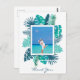 De magnifiques feuillages botaniques de plage bleu-vert ornent cette superbe carte de remerciement de mariage de destination. Créez vos propres cartes de remerciement spéciales en ajoutant votre photographie personnalisée de votre mariage sur une île tropicale. Un modèle de couple heureux et souriant attend votre photo personnalisée avec des feuilles de palmier.