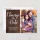 Carte postale moderne Mariage Postponement ou Date Change avec votre photo et écriture de script tendance sur un arrière - plan en bois rustique. Si vous avez besoin d'aide ou d'articles correspondants, veuillez nous contacter à cedarandstring@gmail.com