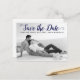 Mariage de script bleu marine moderne Enregistrer la carte postale photo Date. Cette typographie contemporaine Save the Date design comprend une photo en noir et blanc du couple et le texte "Save the Date" en bleu dans une police de script moderne.