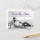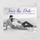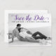 Mariage de script violet moderne Enregistrer la carte postale de la photo Date. Cette typographie contemporaine Save the Date design comprend une photo en noir et blanc du couple et le texte "Save the Date" dans une police de caractères de script moderne.