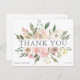 Belle carte de remerciement avec fleurs de pivoine rose pâle aquarelle et écriture élégante sous les feuilles de eucalyptus vert sauge et fleurs jolies. Une carte de mariage botanique chic pour remercier vos invités. Personnalisez ces jolies cartes postales avec vos noms et date de mariage.