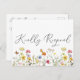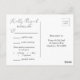 Ce design présente une variété de fleurs sauvages et de papillons dansant sur le fond de la carte postale. "Kindly Respond" dans une police cursive manuscrite est également en face de la carte postale. Tous les détails, y compris les choix de repas, sont au fond. Assurez-vous de laisser le ( ) avant chaque entrée pour créer un espace pour les invités à commencer lors de la modification des choix de repas. L'adresse du couple est déjà imprimée sur la carte postale. Tout ce qu'il faut, c'est un timbre !