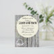 Des planches de bois gris rustique sont le décor de cette charmante invitation de mariage. Une couronne décorative de fleurs, coeurs et dentelle décorent le fond de la carte et une sphère décorative ronde avec feuilles et fleurs sont au centre de la carte avec toutes les informations. Le Country chic à son meilleur.