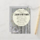 Des planches de bois gris rustique sont le décor de cette charmante invitation de mariage. Une couronne décorative de fleurs, coeurs et dentelle décorent le fond de la carte et une sphère décorative ronde avec feuilles et fleurs sont au centre de la carte avec toutes les informations. Le Country chic à son meilleur.