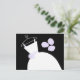 Carte postale à thème nuptiale avec un joli design dans les tons violet, noir et blanc avec une robe mariage stylisée sur un cintre accompagné d'un bouquet sur le devant, et dos violet pâle. Un design personnalisable pour personnaliser avec votre propre texte, photos et idées.