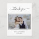 Une carte postale Merci moderne et élégante, personnalisée avec votre propre photo. Ajoutez Votre photo, la date du mariage, vos noms et la note de remerciement. Une carte en noir et blanc tendance. Le texte : Merci sur l'avant et vos noms sur l'arrière sont écrits avec une écriture manuscrite stylisée.