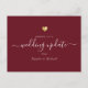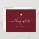 Parfait pour toute mise à jour mariage, ce design de script minimal est à la fois élégant et intemporel. Que la raison de reporter votre mariage soit une catastrophe naturelle, la mort dans la famille, ou une pandémie - cela permet d'envoyer facilement une note rapide sur un changement de date, un report, un changement de localisation, ou toute autre nouvelle. Au verso, vous trouverez une zone de texte personnalisée pour votre mise à jour personnalisée ainsi que de l'espace pour signer personnellement les cartes. C'est la version bordeaux avec un coeur en faux or doux sur le devant, combinant un look calligraphie lettré à la main avec la typographie moderne.