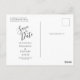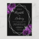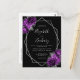Cette élégante carte postale mariage moderne et moderne, à l'état neuf, présente un cadre géométrique argenté orné de fleurs violettes et argentées sur un arrière - plan noir. Le texte personnalisable combine écriture fantaisie gris argenté, cuivre et polices italiques. Ajoutez votre adresse de retour et d'autres informations au verso.