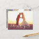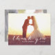 Aucun mot "carte postale" au verso de la carte. Placez deux photos sur vos cartes de remerciement de mariage, l'une sur le devant et l'autre sur le dos. Envoyez votre message de remerciement mariage à vos amis et à votre famille en utilisant cette carte postale de remerciement simple et magnifique avec les mots "merci" écrit dans un script d'écriture blanc superposé. Cartes postales en Merci mariage avec votre photo. Conception par Elke Clarke©. Remplacez l'exemple de photo par le vôtre. Ajoutez votre message de remerciement personnel sur le dos ou laissez vide et écrivez votre message en personne. Autres couleurs disponibles.