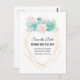 Mariage enregistrer la carte postale date avec un joli bouquet pastel aquarelle succulents. Ces fleurs succulentes, feuilles et sprigs sont un rose et vert doux. Un cadre géométrique tendance avec une bordure en feuille d'or.