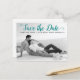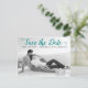Mariage turquoise de script bleu moderne Enregistrer la carte postale de la photo Date. Cette typographie contemporaine Save the Date design comprend une photo en noir et blanc du couple et le texte "Save the Date" dans une police de caractères de script moderne.