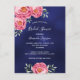 Une invitation branchée et moderne à la douche nuptiale. Un arrière - plan bleu marine bleu foncé. La couleur bleue est inégale. Décoré de fleurs de pivoines roses luxuriantes, de fleurs et de vert gris. Modèles pour que la mariée soit le nom et les informations de la fête. Le nom et est écrit avec un script de style moderne écrit à la main. Texte blanc. Retour : conception simple de carte postale. Cette carte est également disponible dans notre magasin avec un arrière - plan bleu sur le dos.