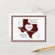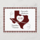 Une façon décontractée et amusante de partager votre joie bien avant votre grande journée. Envoyez ces Texas enregistrer les cartes de date à tous vos amis et votre famille. Le design présente une grande forme d'état avec un coeur fait d'un ruban blanc avec des touches noires. Espace dans le coeur pour votre date et en bas pour votre emplacement. Bordée d'un motif de coordination en vichy. Mélange parfait de classe et de rustique en coque, vous n'avez pas décidé quel style vous allez utiliser ! Les couleurs de l'école texane disponibles sont le rouge, le vert, le vert foncé, le pourpre, le marron, l'orange brûlé ainsi que le bleu et le noir. Produits correspondants disponibles.