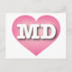 Cette carte postale est composée d'un coeur rose calme, cool et ramassé avec un centre blanchi contenant les lettres coques supérieures MD, gras, blanches, l'abréviation officielle du Maryland, l'état de l'ancienne ligne. Le verso de la carte postale est vide, en attendant votre texte customisé ou vos sentiments manuscrits.