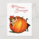 Illustration d'Halloween vintage d'une petite fille cachée dans le citrouille de son chat noir. Artiste : Frances Brundage. Conception © HTM Images