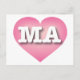 Cette carte postale est composée d'un coeur rose, calme, cool, et ramassé, avec un centre lavé blanc contenant les lettres chaudes, blanches, supérieures coques MA, l'abréviation officielle pour Massachusetts, l'état de la baie. Le revers de la carte postale est vide, en attendant votre texte personnalisé ou vos sentiments manuscrits.