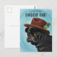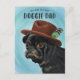 Carte de fête des pères ou d'anniversaire à thème chien mignon avec une illustration peinte à la main d'un chiot pug portant un chapeau fedora marron. Le texte en haut dit "tu es le meilleur papa toutou".