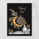 Design élégant pour les salutations Mercis. Argent, or, perles blanches avec spirale de détail complexe sur un arrière - plan noir. Les lettres d'argent et d'or biseautées épellent le "Merci".