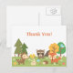 Express votre remerciement avec cette carte postale de voeux mignonne et colorée qui vient avec une variété d'animaux de la tourterelle boisée qui comprennent un oiseau sur l'arbre, un cerf, un renard, un lapin qui saute, un raton laveur, un écureuil avec la noix de cor et un hérisson. Arrière - plan forestier de printemps avec arbres, marguerites blanches, fleurs rouges et champignons pois. Texte : "Merci !"