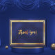 Une carte de remerciement pour un anniversaire jubilaire. Un fond de couleur bleu marine foncé et un cadre en or faux. La couleur bleue est inégale. Sur le devant, un style d'écriture manuscrit et le texte : Merci !