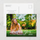 Cette carte postale de remerciement de graduation comporte un cadre photo personnalisé qui remplit l'avant tout. Le texte de calligraphie moderne "merci" apparaît en blanc au-dessus de la photo. Ajoutez votre propre message de remerciement personnel au dos.