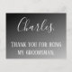 Carte postale de remerciement personnalisée pour votre professionnel de la santé, ce design présente un dégradé noir avec son nom écrit en gros caractères cursifs. Sous le nom est "Merci pour être mon Groomsman" écrit en blanc standard. Personnalisez votre groomsman merci carte postale aujourd'hui!