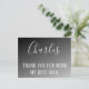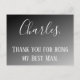 Montrez à votre meilleur homme combien vous l'avez apprécié lors de votre grand jour avec ce carte de remerciements mariage "Merci d'être mon meilleur homme". Cette carte postale de remerciement customisée présente un dégradé noir avec son nom écrit en gros caractères blancs cursifs. Sous le nom est "Merci pour être mon meilleur homme" écrit en blanc standard. Personnalisez votre carte postale de remerciement dès aujourd'hui !