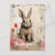 Un lapin brun est représenté au milieu d'un ensemble de fleurs vibrantes sur un fond beige texturé avec diverses marques abstraites et gouttes. La fourrure du lapin est rendue avec attention aux détails, donnant une apparence douce et réaliste, tandis que les roses roses et rouges ajoutent une touche de couleur à la composition.