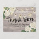 Modèles de carte postale Merci mariage - Elégant blanc belle aquarelle Hydrangea Flowers et des lampes à cordes sur Arrière - plan de bois rustique. Un Design Parfait Pour Votre Grand Jour ! Tous Les Style De Texte, Couleurs, Tailles Peuvent Être Modifiés En Fonction De Vos Besoins.