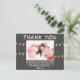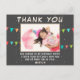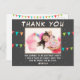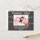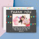 Drapeaux mignons grises d'anniversaire photo merci carte postale. Merci à votre invité d'être venu à la fête d'anniversaire de votre enfant! Le design a des drapeaux colorés de fête d'anniversaire et une photo dans un cadre sur un arrière - plan gris avec des taches blanches - insérez votre photo dans le modèle. Changez la note de remerciement et le nom de l'enfant.